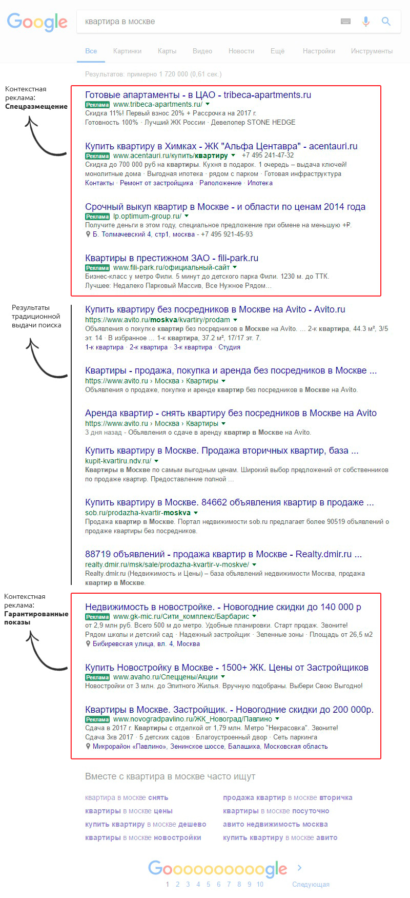 Поисковая реклама отображается на странице выдачи согласно введённому запросу пользователя. Такие объявления появляются в двух местах: над результатами общей выдачи либо справа от них.